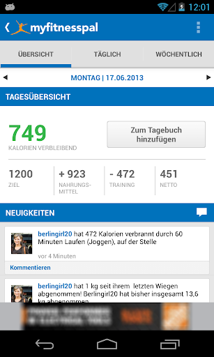 Die letzten Tage liefen nicht ganz so gut. Habe zwar meine 1520 kcal am Tag nie wirklich stark überschritten, aber die Snacks waren einfach viel zu viel! Ich darf mir nicht mehr so viel Zeugs in die Schreibtischschublade legen, auch wenn es sich dabei "nur" um Zwieback handelt (mit Kokos... mmmhhh ist das Zeug lecker!). Hoffe das Wochenende wird nicht ganz so schlimm. Schließlich fahre ich mit Läuferinnen nach Hamburg, die wollen sich doch bestimmt auch gesund ernähren!?
