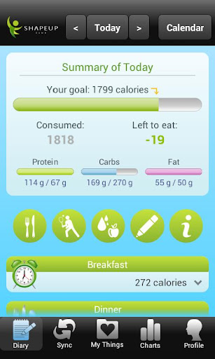 ShapeUp bietet ein Ernährungs- und Sporttagebuch. Die Nutzung ist kostenlos eingeschränkt möglich. Für viel Featuers benötigt man die Gold-Mitgliedschaft für 6,86 € im Monat (und ich will ja nichts mehr bezahlen). Die Nahrungsmitteldatenbank hat mich nicht wirklich überzeugt: Von natürliche Produkten wie z. B. Äpfel gab es eine ganze Liste mit unterschiedlichen Kalorienangaben für die gleiche Menge. Das feminine Design ist auf den ersten Blick ansprechend, ist aber auf Dauer doch ein bisschen too much.